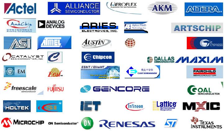 主要品牌有:ABILIS SYSTEM, Ambarella Inc., Analog Power, Benchmarq,Cypress,Catalyst,Ceramate,Chipcon,Dallas Maxim,EM Microelectronic,Eon Silicon,ESMT,Excel,Semi,Fairchild,Freescale,Gencore,Holtek,ISSI,ICT,Anachip,Infinion,Linksmart,